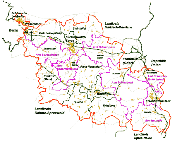 Städte ( 6 amtsfreie) 1. Beeskow (Bezkow) 7 Ortsteile: Bornow, Kohlsdorf, Krügersdorf, Neuendorf, Oegeln, Radinkendorf, Schneeberg 2. Eisenhüttenstadt 4 Stadtbezirke: Diehlo (Źělow), Fürstenberg (Oder), Neustadt, Schönfließ 3. Erkner 4. Friedland (Nl) 16 Ortsteile: Chossewitz (Kósojce), Groß Briesen, Groß Muckrow, Günthersdorf, Karras (Karas), Klein Muckrow, Kummerow (Komorow), Leißnitz (Lěsnica), Lindow, Niewisch, Pieskow, Reudnitz, Schadow, Weichensdorf, Zeust 5. Fürstenwalde/Spree 3 Stadtteile: Fürstenwalde-Mitte, -Nord, -Süd 6. Storkow (Mark) 14 Ortsteile: Alt-Stahnsdorf, Bugk, Görsdorf, Groß Eichholz, Groß Schauen, Kehrigk, Klein Schauen, Kummersdorf, Limsdorf, Philadelphia, Rieplos, Schwerin, Selchow, Wochowsee